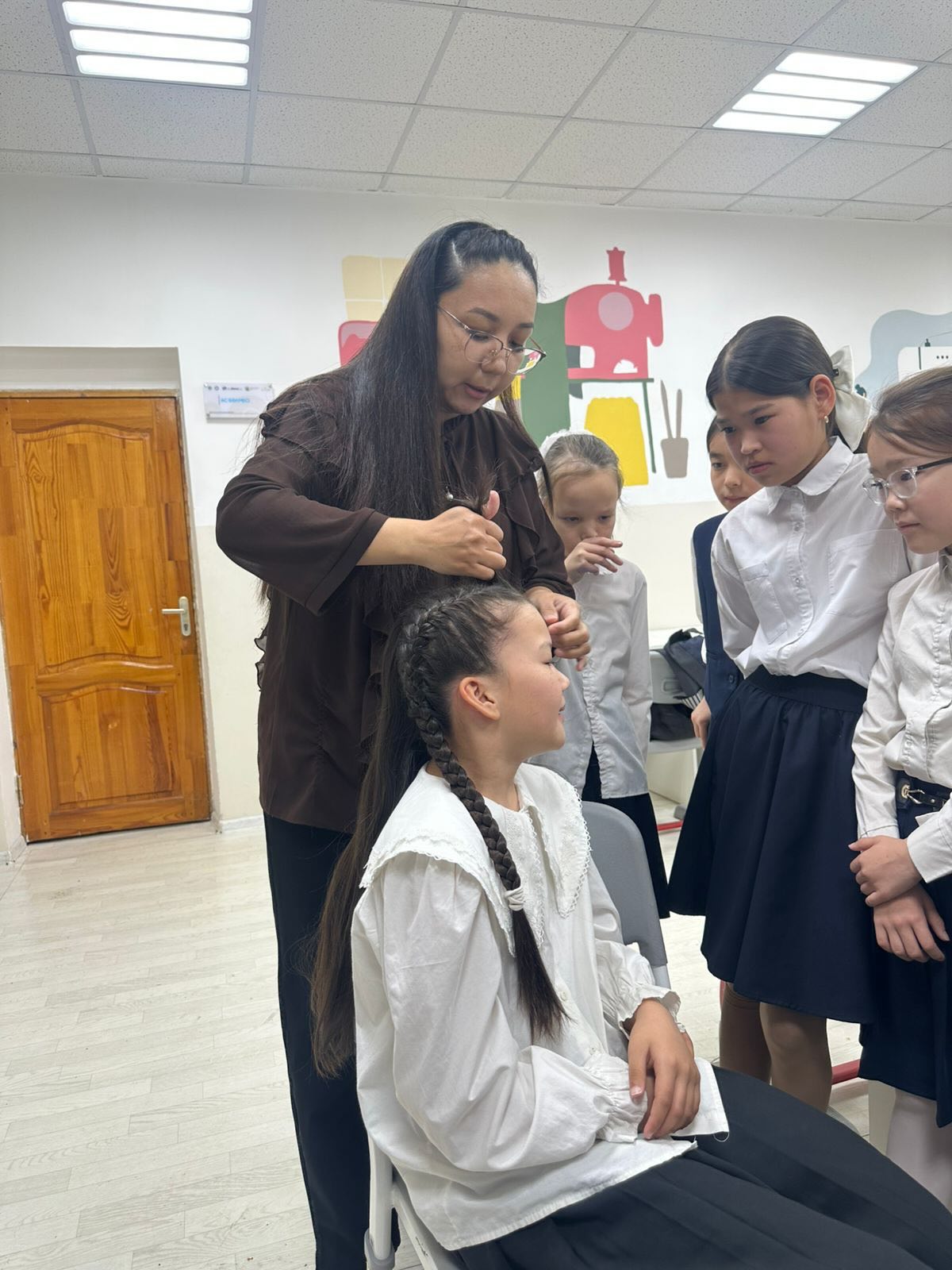 5 в сыныбына өткізілген шарада оқушының анасы қыздарға күнделікті өмірде жасауға болатын қарапайым әрі әдемі шаш үлгілерін көрсетті. Шашты дұрыс тарау, жинау, өрім жасау жолдары түсіндірілді. Қыздар өздері де қатысып, шаш үлгілерін жасап көрді.